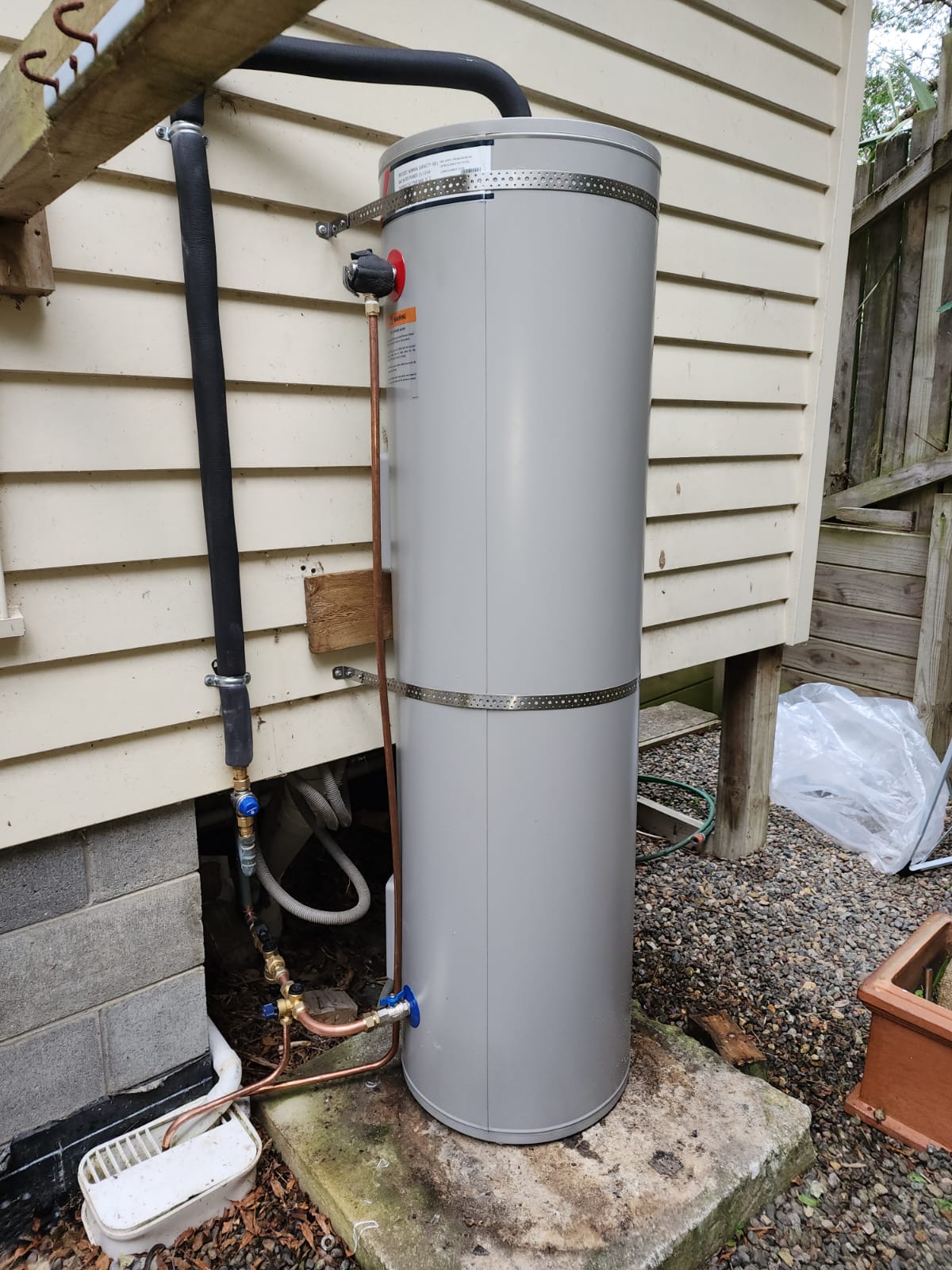 Scope: Replace existing Mains Pressure Heatpump Hot water cylinder which no longer offers efficiency, suffers from contaminated water due to internal runsting and causes irregular electrical faults. Installation of new External Stainless Steel Rheem Hot Water Cylinder. Reuse electrical point and concrete base in the same position. Earthquake restrains not complete at time of image.